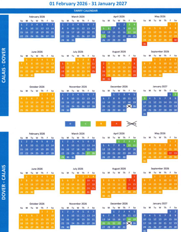 Passagetarief P&O-Ferries Retour naar Engeland Calais-Dover v.v. 2026/2027 Kleur van de letter komt overeen met onderstaande kalender |