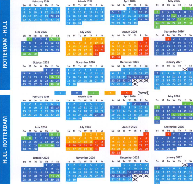 Passagetarief P&O-Ferries Standaard Retour Rotterdam Europoort-Hull v.v. 2026/2027 Kleur van de letter komt overeen met onderstaande kalender |